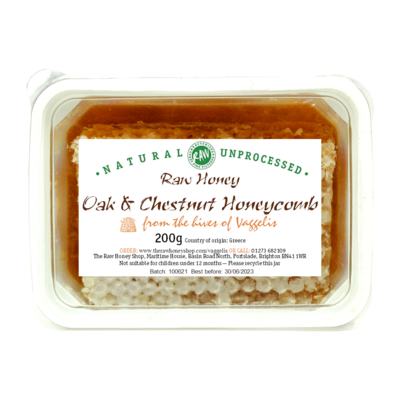 This Raw Greek Oak and Chestnut Honeycomb is perfect for those who love dark, strong honeys. Honeycomb is the best way to eat honey because honeycomb is the honey exactly as it was in the hive. It contains all the good nutritious bits - such as bee bread (fermented pollen mixed with honey and enzymes), royal jelly and propolis in the cells.