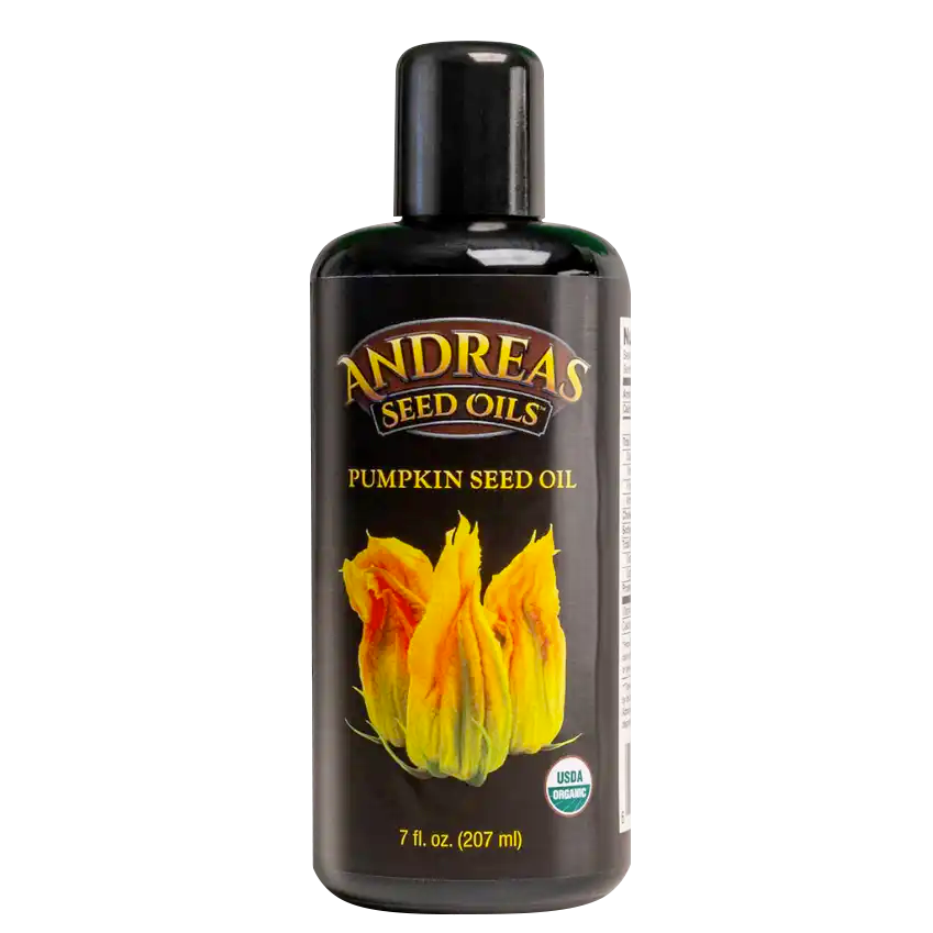 Andreas Pumpkin Seed Oil has a smooth nutty flavor and aroma. These seeds are mineral-rich, full of healthy fatty acids, and high in vitamin K. The deep green color of this nourishing oil comes from antioxidant-rich phytochemicals.