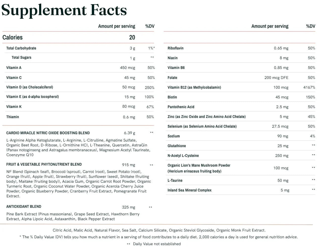 We don’t compromise: Gluten free, 100% natural, organic, non-GMO, made in the USA.Product Details: Cardio Miracle recommended dosage of one scoop, twice daily.Superior bioavailabilityOver 700 natural products that can be isolated from the 50+ ingredients derived whole-food bioavailable nutrients delivered in each and every serving.Made for everyoneYoung, old, and in between, we all need more nutrients and nitric oxide in our bodies.Backed by scienceIn vitro and in silico studies by world-leading scientists and PhDs. ConvenientOne scoop twice a day - it’s that easy!AffordableLess than you'd pay for a cup of coffee.Boosts EnergyNitric oxide regulates and directs muscle function and performance by stimulating vasodilation. This increases blood flow to working muscles, leading to increased oxygen transport, delivery of nutrients to skeletal muscle, and reduction in blood pressure. Bottom line… your energy increases and your physical performance improves.Helps RecoveryNitric Oxide stimulates blood vessel flexibility, thereby improving blood viscosity and flow, blood supply, and oxygen levels. This process promotes muscle Fiber repair and improves lactic acid and clearance, leading to quicker recovery.Supports immunityNitric oxide is recognised as one of the most active and versatile molecules in the immune system. It is powerful toxic defence molecule against infectious organisms. It regulates the functions, growth, and death of many immune and inflammatory cell types (including T lymphocytes, macrophages, mast cells, antigen-presenting cells, NK cells and neutrophils). Hence, it controls autoimmune processes and chronic inflammatory and degenerative diseases.Improves Mental ClarityNitric Oxide is known to relax blood vessels and to increase blood supply to the brain, thus inducing neuronal activity. Nitric Oxide plays a vital role in both the learning process and memory. It modulates the release of neurotransmitters acting as a cellular communicator in brain plasticity and development   Testimonials Here’s what some of our friends are saying:I am now going on my 7th - 8th canister of Cardio Miracle (2 scoops a day). I am happier and more energetic than I have ever been. NO depression, NO anxiety, NONE! My energy level is quite honestly ridiculous and I am 59 years old. You care only for us, the best products to help us! My life has changed immeasurably with God and Cardio Miracle on my side. - Jaynie B, GA   I am a new user of Cardio Miracle. I notice that my mood and my energy is a lot better since day one. - Randy T, MD   John Hewlett is amazing and got me interested in trying Cardio Miracle. For me personally, I noticed I have more energy and oxygen. When I heard about Cardio Miracle I thought to myself, "but I'm not getting nitric oxide in my system." My dad is on it too and says he feels better, and he has all kinds of health problems. I am definitely hooked on this product, I have to admit. Please don't ever stop making Cardio Miracle! - Ronald P.I am lucky to be alive. I had to close my business as a result of my heart issues and have tried many pricey supplements over the years. I think there is something about Cardio Miracle being a drink, rather than hard pills, because it works well for me. I noticed a difference in my energy level and my breathing within a couple weeks of taking Cardio Miracle. - Dee P   I've been taking Cardio Miracle twice a day for almost one month. After 3 days, my ankles stopped swelling at night. After a couple of weeks, my sciatica disappeared. I've also lost 6 lbs and no longer crave sweets. Recommending this to my family and friends! - Lisa H, TX   Thanks for sharing Cardio Miracle with us. We take it every day. We're so thankful for the benefits and reassurance of Cardio Miracle, especially after Scott's heart attack in 2018. - Scott and Janece L,