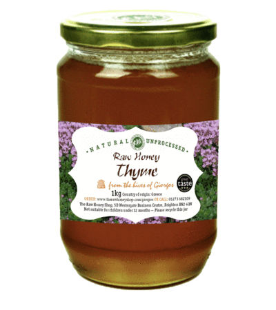Raw Greek Thyme honey, This is one of the best Thyme honeys in the world - as demonstrated by the top awards it keeps winning. In 2020, the judges at The Great Taste Awards said: "This is a glorious honey, with a clear amber colour and delicate herbal aroma.... develops slowly with complex layers of fresh thyme and beautifully balanced sweetness....with a finish that allows the just-right sweetness and light herbal tastes to melt together."